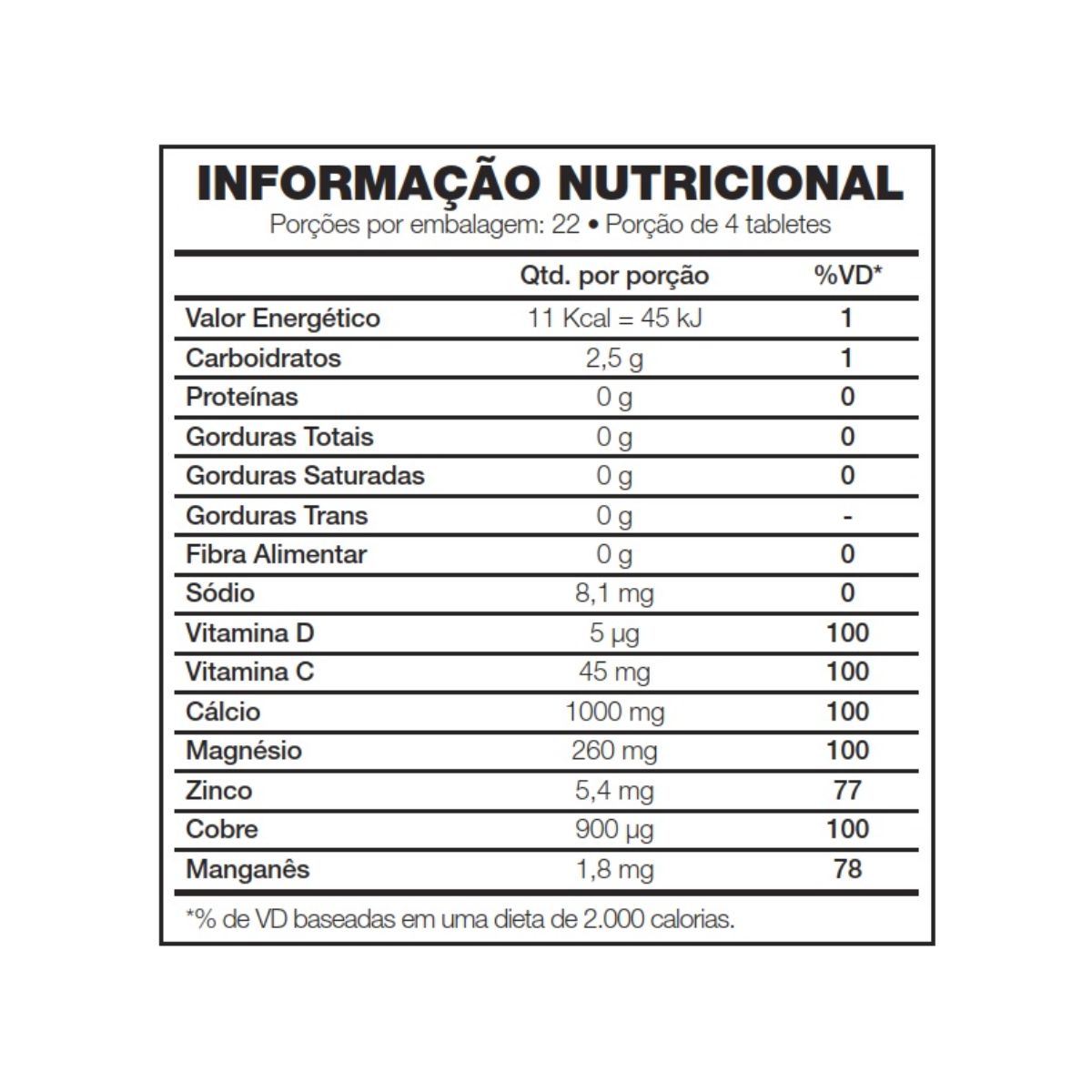 Malato bicálcio, óxido de magnésio, ascorbato de cálcio (Vit. C), malato de dimagnesio, glicinato quelato de zinco, glicinato quelato de manganês, glicinato quelato de cobre, colecalciferol (Vit. D).